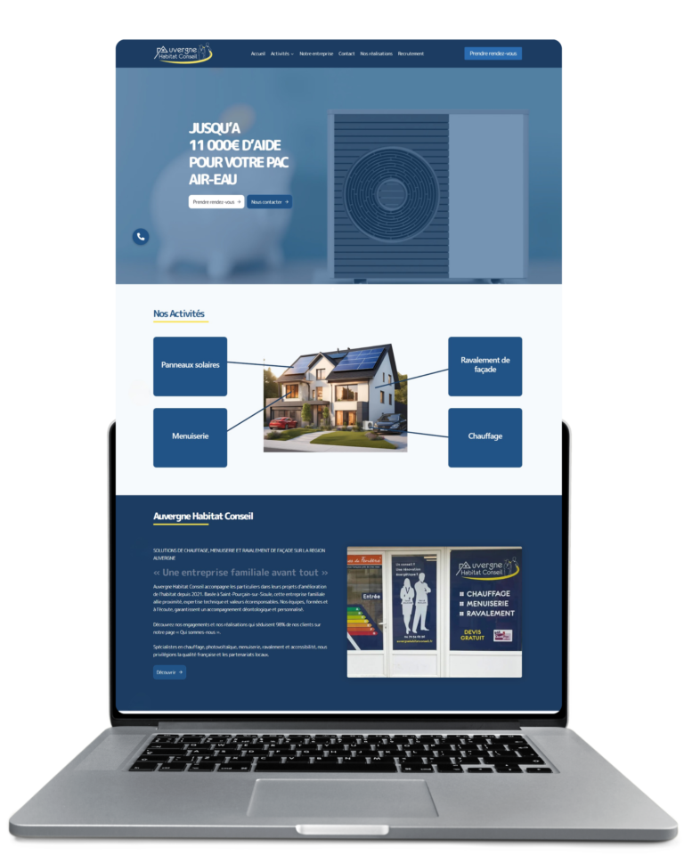 Pour Auvergne Habitat Conseil, une solution digitale complète : un site vitrine pour valoriser leur expertise et un site de recrutement dédié, accompagnés d’une gestion active de leurs réseaux sociaux et d’une maintenance régulière pour une présence en ligne optimale.
