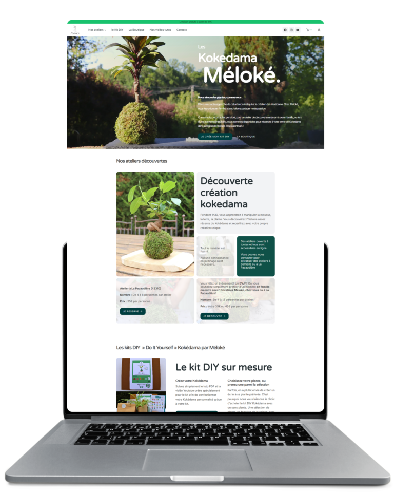 Pour Méloké : une boutique en ligne clé en main pour vendre leurs Kokédama, complétée par une gestion active des réseaux sociaux et une maintenance régulière pour assurer une présence digitale performante et sans souci